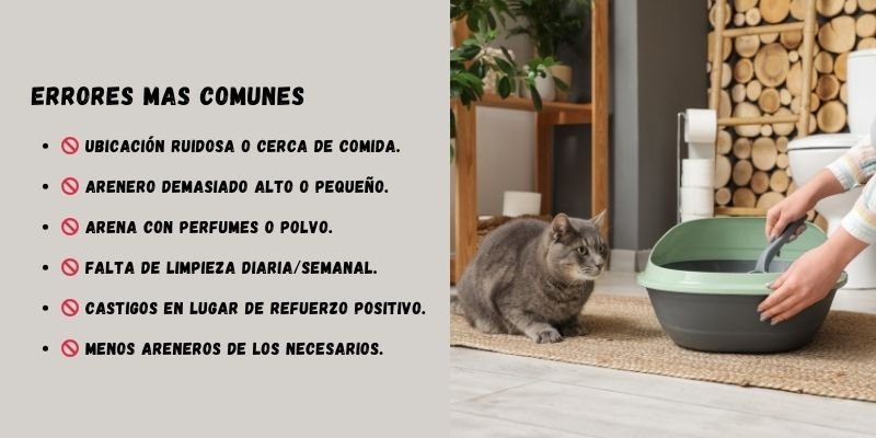 - ❌ No cambiar la arena completa regularmente → malos olores y bacterias.