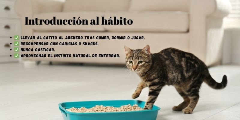 - Rutina emocional: Convertir el momento en algo tranquilo y seguro ayuda a que el gatito relacione el arenero con bienestar.