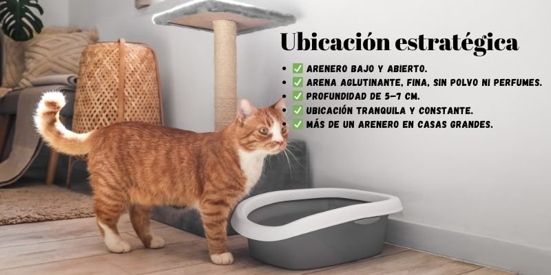 - ❌ Colocar el arenero cerca de la comida y agua.