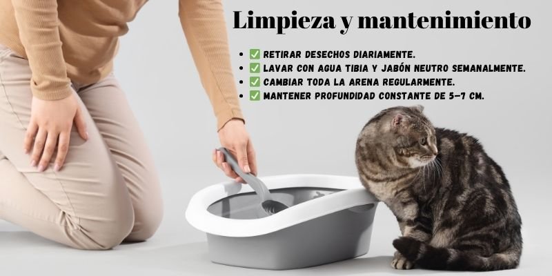 👉 Solución: Limpieza diaria con pala, cambio semanal de arena y lavado con jabón neutro.