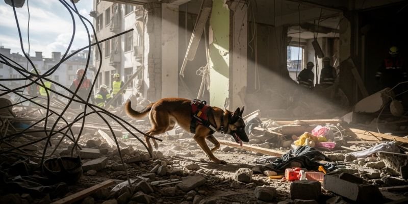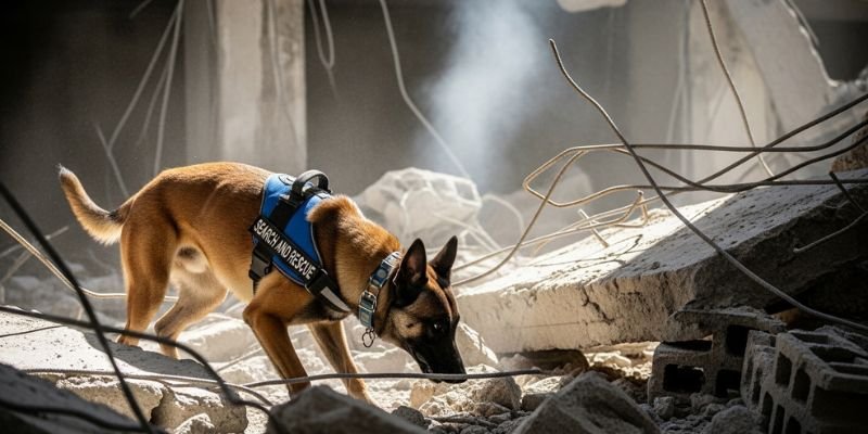 Los científicos y entrenadores han documentado que los perros de rescate enfrentan riesgos significativos: problemas respiratorios por el polvo, desgaste en las almohadillas y estrés emocional.