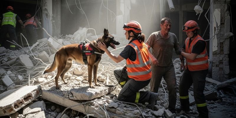 | Husky en Túnez | Terremoto | Tras 56 horas de trabajo, salvó 40 vidas atrapadas bajo los escombros, convirtiéndose en héroe internacional. | Revista Literaria el Candelabro – Husky, el Pastor Belga que Salvó 40 Vidas: Héroe Canino en la Catástrofe |