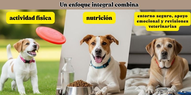 La prevención no debe limitarse a un solo aspecto (como la alimentación o el ejercicio), sino que debe contemplar varios pilares de cuidado simultáneamente. Un enfoque integral combina nutrición, actividad física, entorno seguro, apoyo emocional y revisiones veterinarias para mantener articulaciones sanas y movilidad plena.