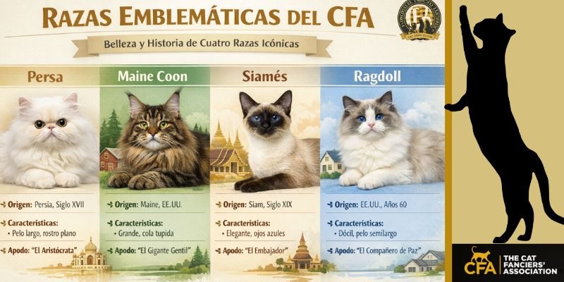 Cada una de estas razas no solo representa un estándar físico dentro del CFA, sino también una historia cultural y emocional que conecta a los gatos con la vida humana: desde el lujo aristocrático del Persa, la rusticidad noble del Maine Coon, la espiritualidad del Siamés, hasta la ternura moderna del Ragdoll.