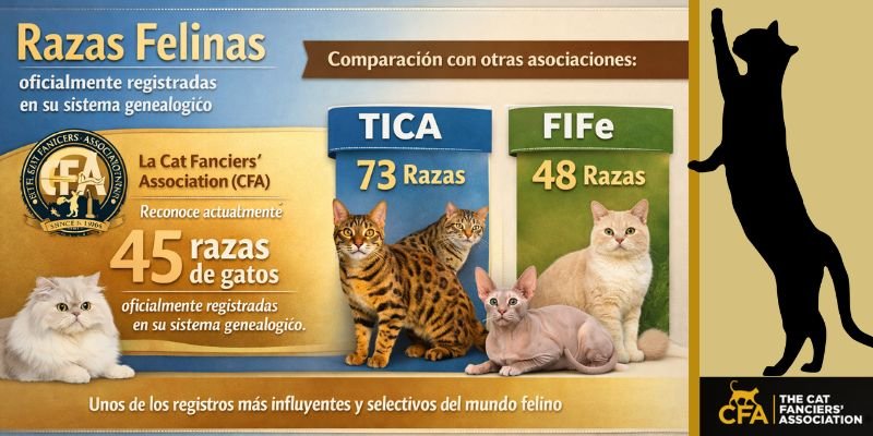 La Cat Fanciers’ Association (CFA) reconoce actualmente 45 razas de gatos oficialmente registradas en su sistema genealógico. Esto la convierte en uno de los registros más influyentes y selectivos del mundo felino, en comparación con otras asociaciones como TICA (73 razas) o FIFe (48 razas).