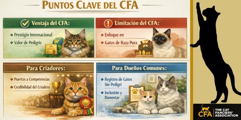 Aunque el CFA acepta gatos domésticos mediante programas especiales, su prioridad sigue siendo los gatos de raza pura. Esto puede percibirse como una limitación, ya que el enfoque principal está en preservar estándares de pedigrí más que en la diversidad completa de la especie.