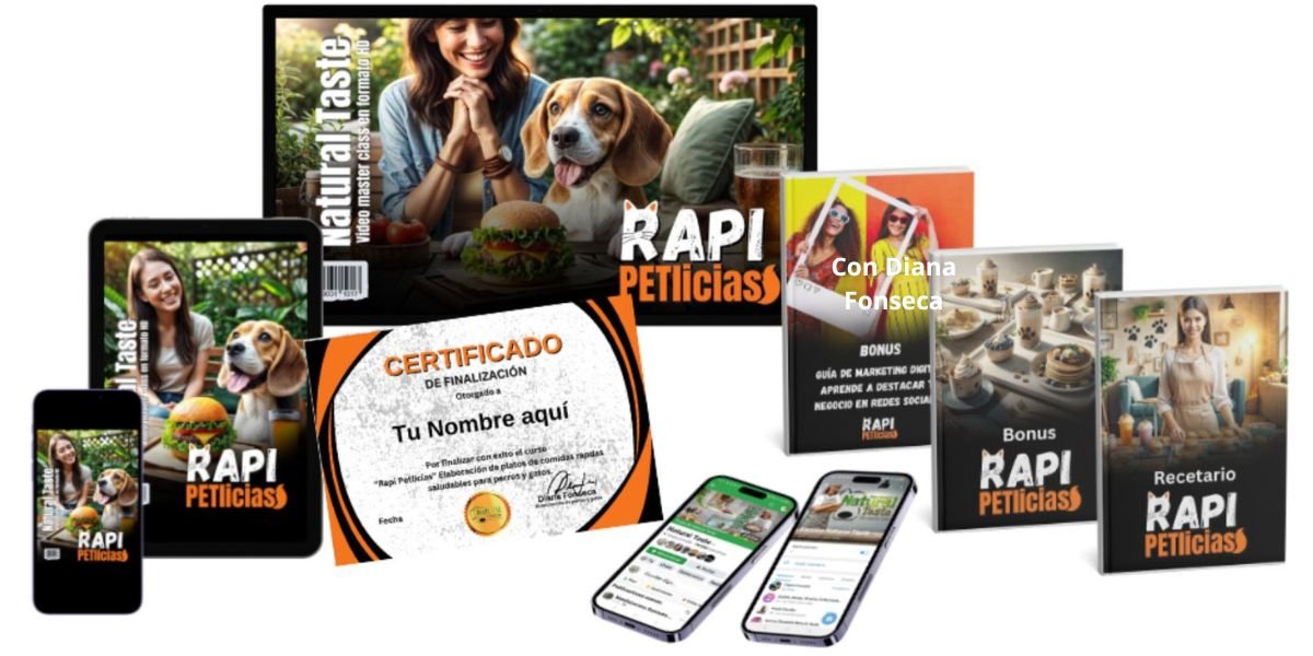 “Rapi Petlicias” es un curso Online mas en el mundo de los negocios de PET-FRIENDLY. Descubre como destacar en el mercado de la comida rápida para mascotas con hamburguesas, pizzas y platillos irresistibles para perros y gatos, mientras cuidas de su salud y maximizas tus ingresos.