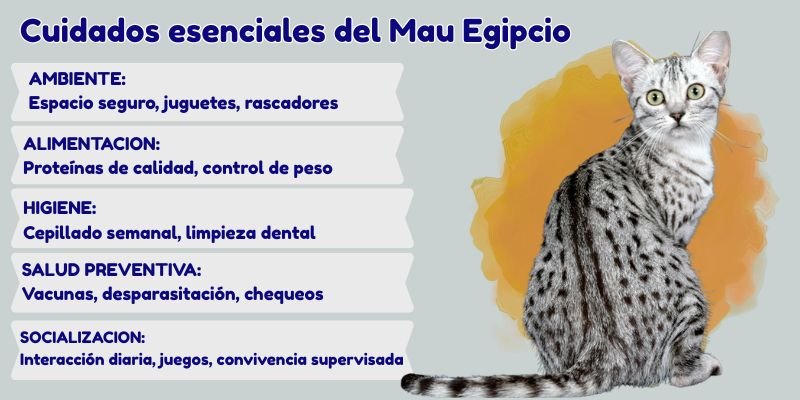 El Mau Egipcio requiere cuidados integrales que combinan nutrición adecuada, salud preventiva, ambiente enriquecido y afecto constante. Con estos pilares, se convierte en un compañero leal y saludable durante muchos años.