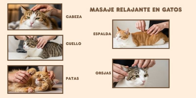 | GATO | Caricias delicadas en frente y entre orejas | Masaje suave en cuello y nuca | Caricias descendentes en columna | Presión ligera en patas traseras y delanteras | Masajes cortos en base de orejas |