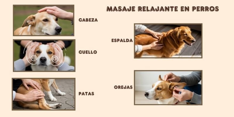 | PERRO | Caricias suaves en frente y parte superior | Movimientos circulares en laterales y base | Pasadas largas desde la cruz hasta la cola | Presión ligera en muslos, pantorrillas y almohadillas | Masajes suaves en base y parte externa |